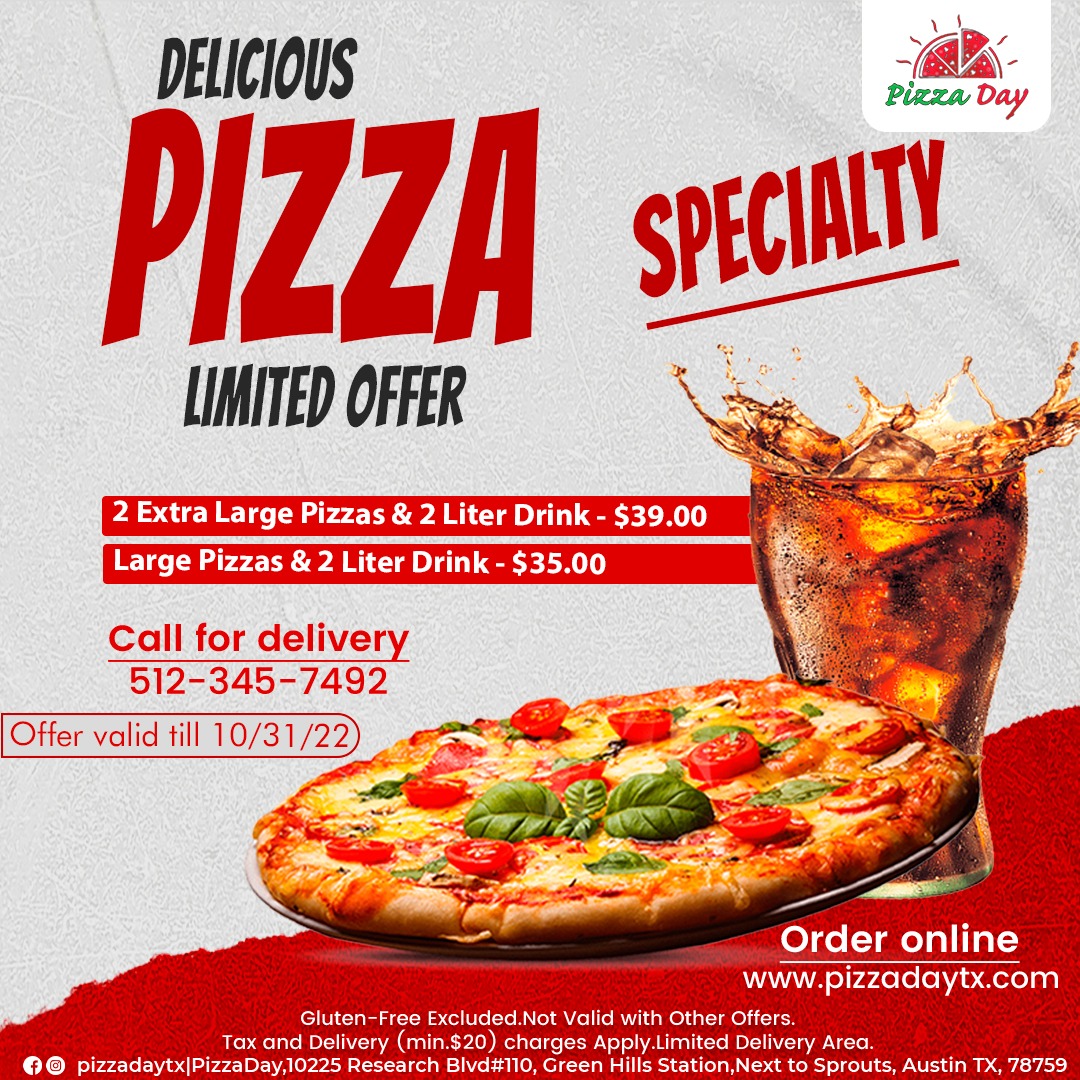 $5 off Austin's Pizza Coupons & Specials (Oct. 2022) - Offers.com Reveal Code $5 Off $5 off 2 or more Large Pizzas Verified Reveal Code SALE Large 2-Topping Pizzas Now: 3 for $33 Verified Reveal Code SALE Large 2 Topping Pizzas for $10 Verified Used 11 Times Reveal Code + Show Details & Exclusions SALE 10" 2-Topping Pizza and a Can of Soda for $8.29 Verified Reveal Code + Show Details & Exclusions 50% Off